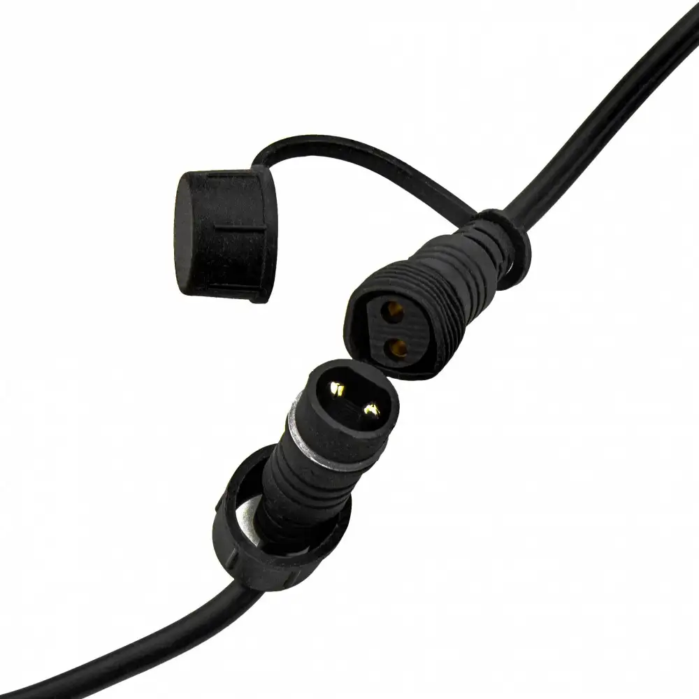 Cette guirlande étanche (IP65) possède un système d'accroche au dessus de chaque douille pour une installation facile et rapide. Vous pouvez allonger cette guirlande jusqu'à 200 mètres ou l'utiliser en tant que rallonge afin d'avoir la longueur que vous souhaitez. Cette guirlande inclus des raccords "Conex" spécifiques et totalement étanches aux intempéries. Attention, Ces guirlandes sont fournies avec un câble d'alimentation de 0,5 mètre, 2,5 mètres ou 5 mètres. Choisissez votre câble d'alimentation en fonction de la distance entre votre prise murale 230V et le lieu souhaité du départ de l'éclairage de la guirlande.