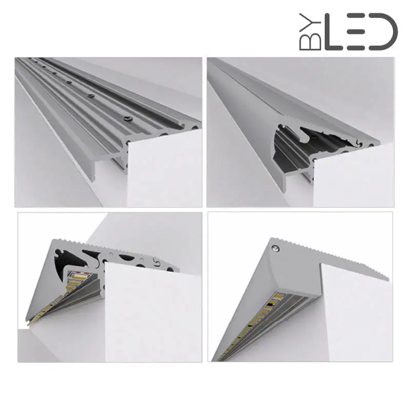 Ce profilé en aluminium avec finition anodisée pour ruban LED est spécialement conçu pour éclairer les contre-marches d’escalier, en se fixant au nez de marche par vissage et/ou collage. Les vis sont dissimulés par un couvercle de finition. Également, des embouts sont inclus pour être fixés de chaque côté du profilé afin de parfaire le résultat.