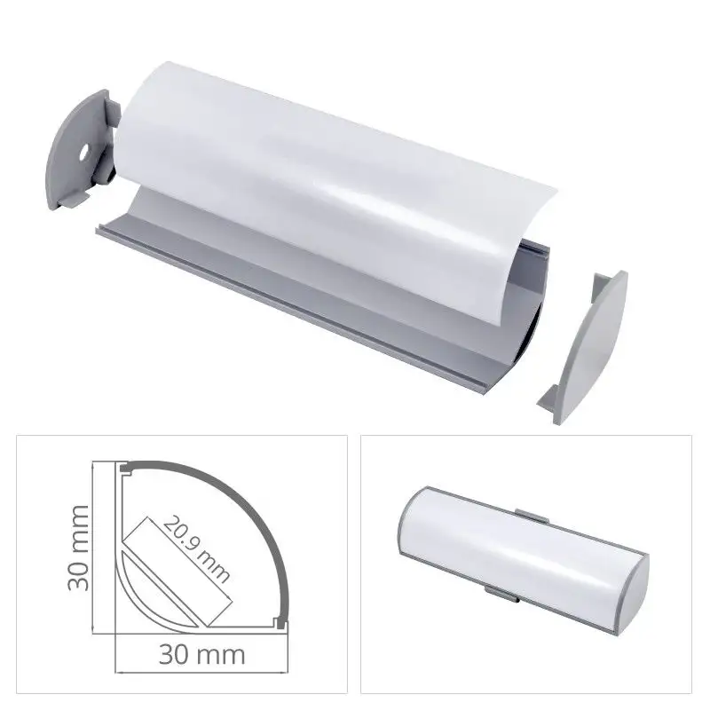 Ce magnifique modèle de profilé d'angle se distingue par sa largeur qui peut accueillir deux rubans de 10mm de large chacun ou un ruban double 19,2W/m ou 28,8W/m. Si vous recherchez une diffusion lumineuse intense et intacte, choisissez un diffuseur transparent. Pour un éclairage plus diffus et homogène, préférez le diffuseur givré.