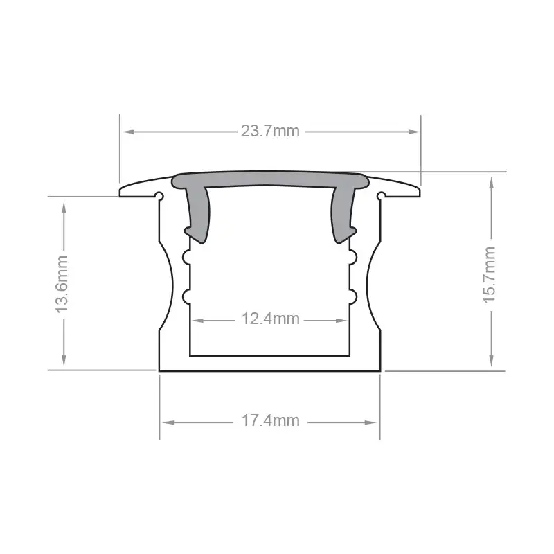 Ce modèle est livré avec un diffuseur opaque, dit “givré”, permettant d’uniformiser la lumière sur toute la longueur du profilé, créant ainsi une lumière sans discontinuité. Le ruban LED va se positionner sous le diffuseur, collé au fond du profilé. Il ne doit pas dépasser 12 mm en largeur.