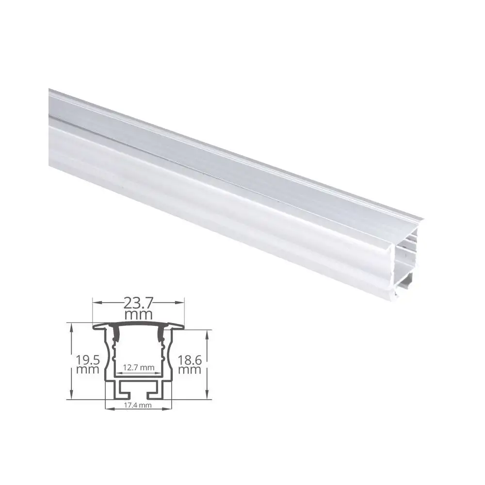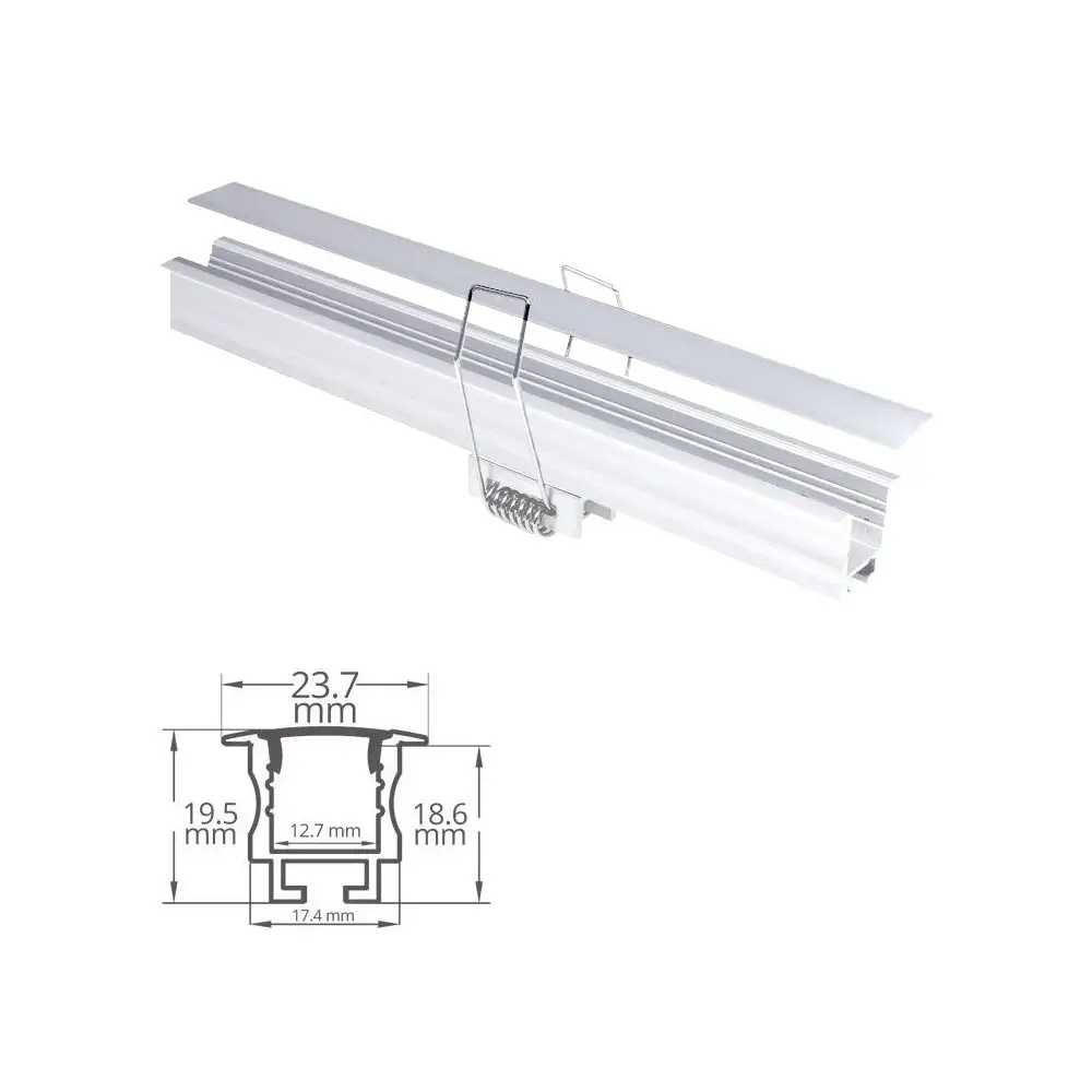 Ce profilé s’installe de la même manière qu’un spot encastrable grâce aux clips de fixation fournis à raison de deux par mètre de profilé. Le ruban quant à lui, se colle à même le profilé, dans l’espace prévu à cet effet, sous le diffuseur. Ce dernier, livré avec votre profilé, est givré, gommant ainsi l’espace entre les LED pour un rendu lumineux tout à fait homogène.
