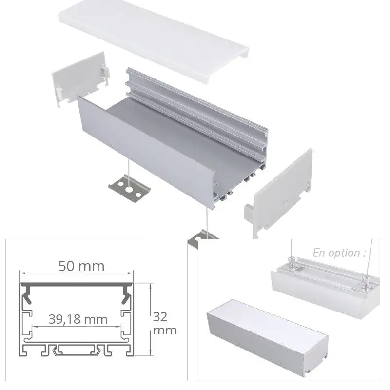 Ce profilé peut se fixer sur tout support (bois, béton, etc.) grâce au clips de fixation en inox inclus. Il peut aussi être suspendu à l’aide du kit de suspension vendu séparément, pour réaliser une suspension LED linéaire.