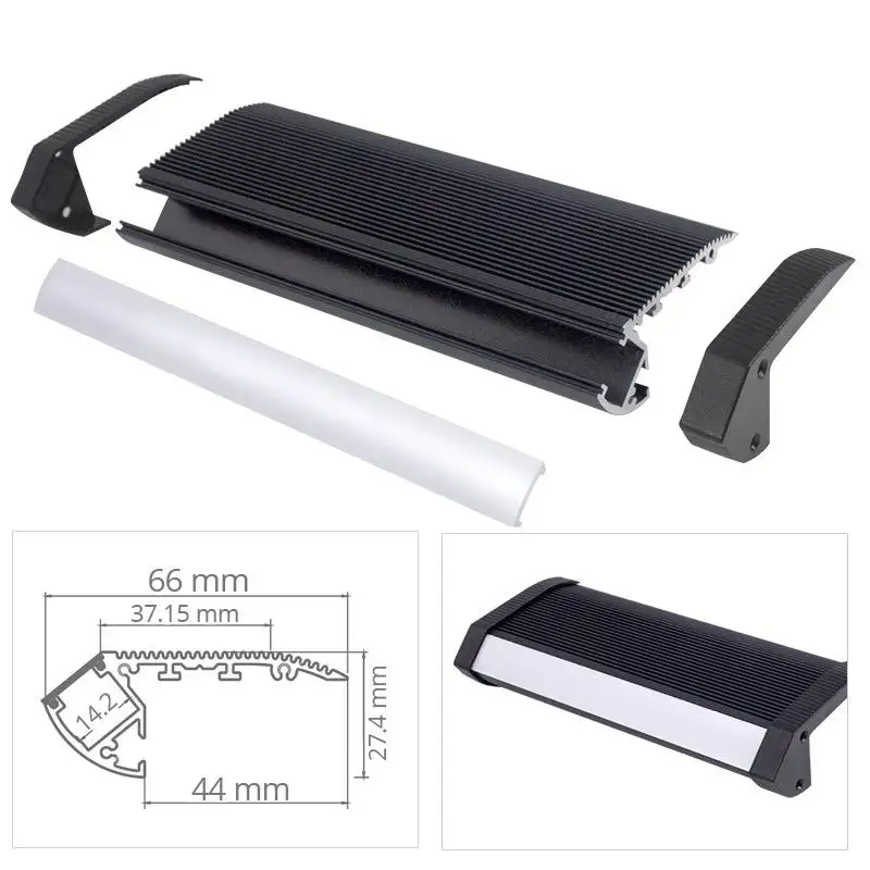 Le diffuseur, fourni également, atténue le rendu lumineux pour ne pas éblouir les usagers et permet une parfaite répartition de la lumière sur l’ensemble du profilé en aluminium.