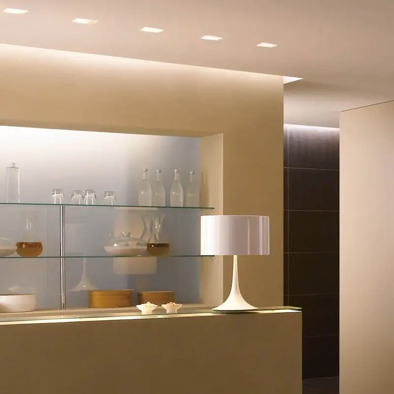 Ce plafonnier carré s’encastre dans du Placo ; grâce à sa matière en plâtre, les rebords deviennent invisibles, comme si le spot faisait partie intégrante du plafond, pour un rendu hautement esthétique et moderne.