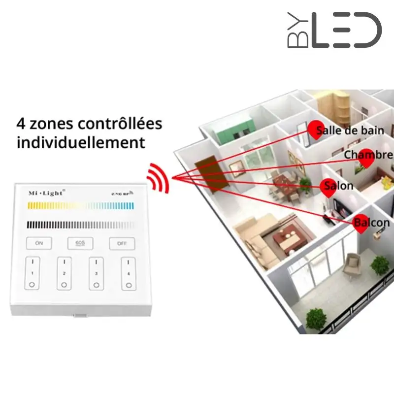 Cette télécommande CCT vous permet également de gérer 4 zones, soit 4 contrôleurs CCT indépendamment ou de manière groupée.